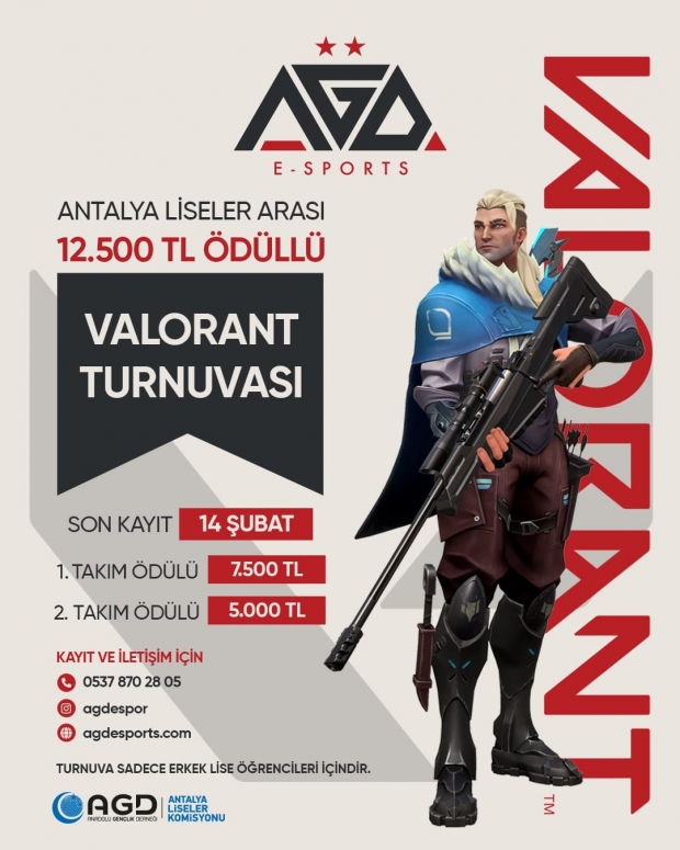 Turnuva, Antalya’daki erkek lise öğrencilerine yönelik olup katılım için son başvuru tarihi 14 Şubat 2025’tir. Başvurular, agdesports.com web sitesi üzerinden alınacak ve katılım koşulları detaylı bir şekilde kayıt sayfasında mevcuttur. Katılımcılar, turnuva süresince yalnızca Valorant oyununda yeteneklerini sergileyecektir.