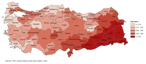 Türkiye'de 2023 yılında ortalama hanehalkı büyüklüğünün en yüksek olduğu il, 4,86 kişi ile Şırnak oldu. Şırnak ilini 4,67 kişi ile Şanlıurfa ve 4,61 kişi ile Batman izledi. Ortalama hanehalkı büyüklüğünün en düşük olduğu iller ise 2,54 kişi ile Çanakkale oldu. Bu ili, 2,60 kişi ile Giresun ve 2,61 kişi ile Balıkesir izledi.