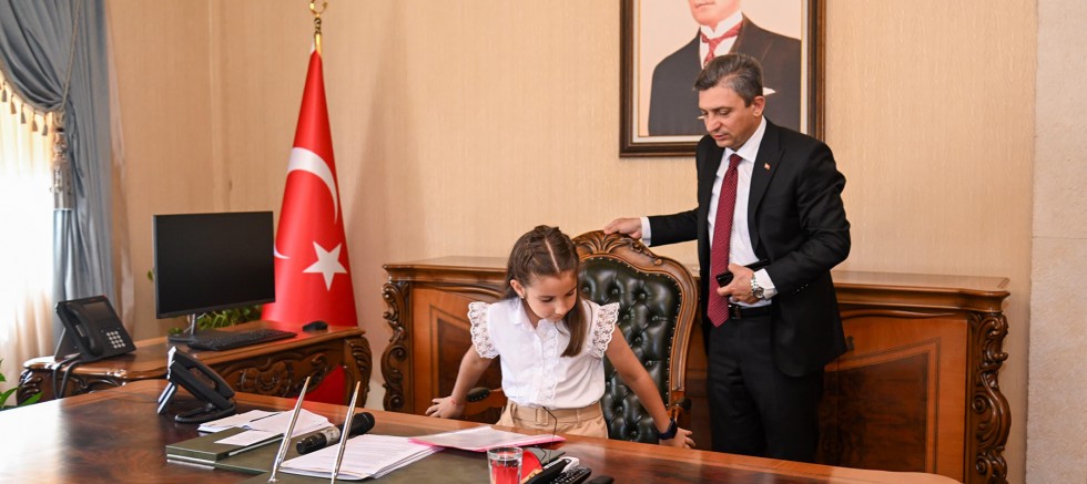 Antalya Valilik makamında düzenlenen sembolik törende Vali Hulusi Şahin, makam koltuğunu Cengiz Topel İlkokulu 4. Sınıf Öğrencisi Beren Arslan'a devretti.