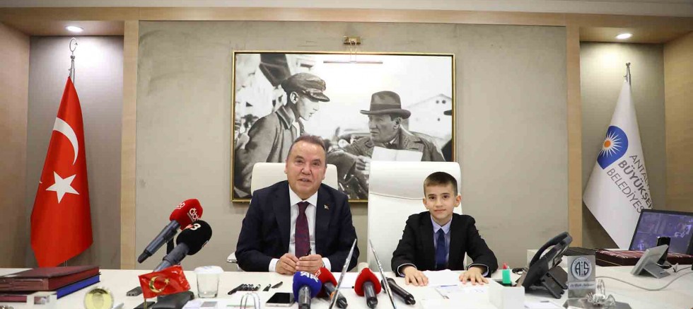 Çelenk sunma törenin ardından Büyükşehir Belediye Başkanlığı makamında devir teslim töreni yapıldı. Büyükşehir Belediye Başkanı Muhittin Böcek, koltuğunu Fatmagül Özpınar İlkokulu 4. Sınıf öğrencisi Anıl Kılınçkaya’ya devretti. Devir teslimde Anıl Kılınçkaya’ya Milli Eğitim İlçe Müdürü Yakup Hoplar, Okul Müdürü Mehmet Aşık Doğan, annesi Dilek Kılınçkaya ve babası Mustafa Kılınçkaya eşlik etti.