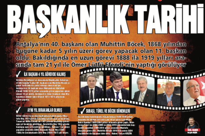 Antalya'nın 40. başkanı olan Muhittin Böcek, 1868 yılından bugüne kadar 5 yılın üzeri görev yapacak olan 11. başkan oldu. Bakıldığında en uzun görevi 1888 ila 1919 yılları arasında tam 21 yıl ile Ömer Lütfü Efendi'nin yaptığı görülüyor.