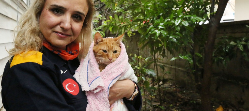 "'Saruhan' benim bahçemde baktığım kedilerden biri. Çok usludur, çok akıllıdır. Dün 2 kedimi kaybettim aslında. Birini buldum, balkona kadar suydu, çarşafı uzatıp, onu öyle kurtarabildim, hemen geldi o. Ama 'Saruhan'ı bulamadım. Çok ağladım, sürekli kapıya çıktım, çünkü merdivenin en son basamağına kadar suydu, kapıyı bile açamıyorduk. Evde 12 saat kadar mahsur kaldık. Sabaha karşı çok dua ettim, artık sesini duyurunca, bana sesini duyurdu, aşağıda bodrumda iki odalı bir yer. Hemen girişteki odada valizin üzerindeydi. Çok soğuktu su, mazotta karışmıştı suya, kokusu hala geliyor. Kızımla beraber indik. Kızım giremedi, çok soğuktu onu sokmadım, duamızı ettik girdik. Çok şükür aldık, kurtuldu. Onlar için değer. 2 yıldır AFAD gönüllüsüyüm, AFAD'a gönlümüzü verdik. Yardıma ihtiyacı olanların yanındayız."