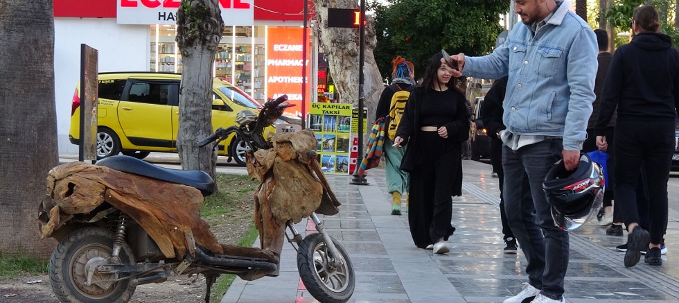 ANTALYA'da bir sanat atölyesinde çalışan Osman Dönmez (40), işe gidip gelmek için kendisine elektrikli motosiklet topladı. Dönmez, gövdesini sedir ağacı parçalarıyla kapladığı motosikleti görenlerin ilgisinin hoşuna gittiğini dile getirdi.