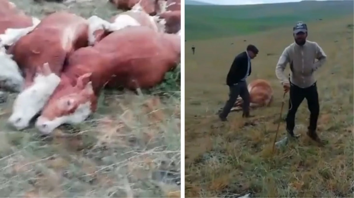 Yıldırımın isabet etmesiyle telef olan büyükbaş hayvanların yerde yattığı görüntüler görenleri oldukça üzdü. Telef olan hayvanlar, olay yerinden kaldırıldı.