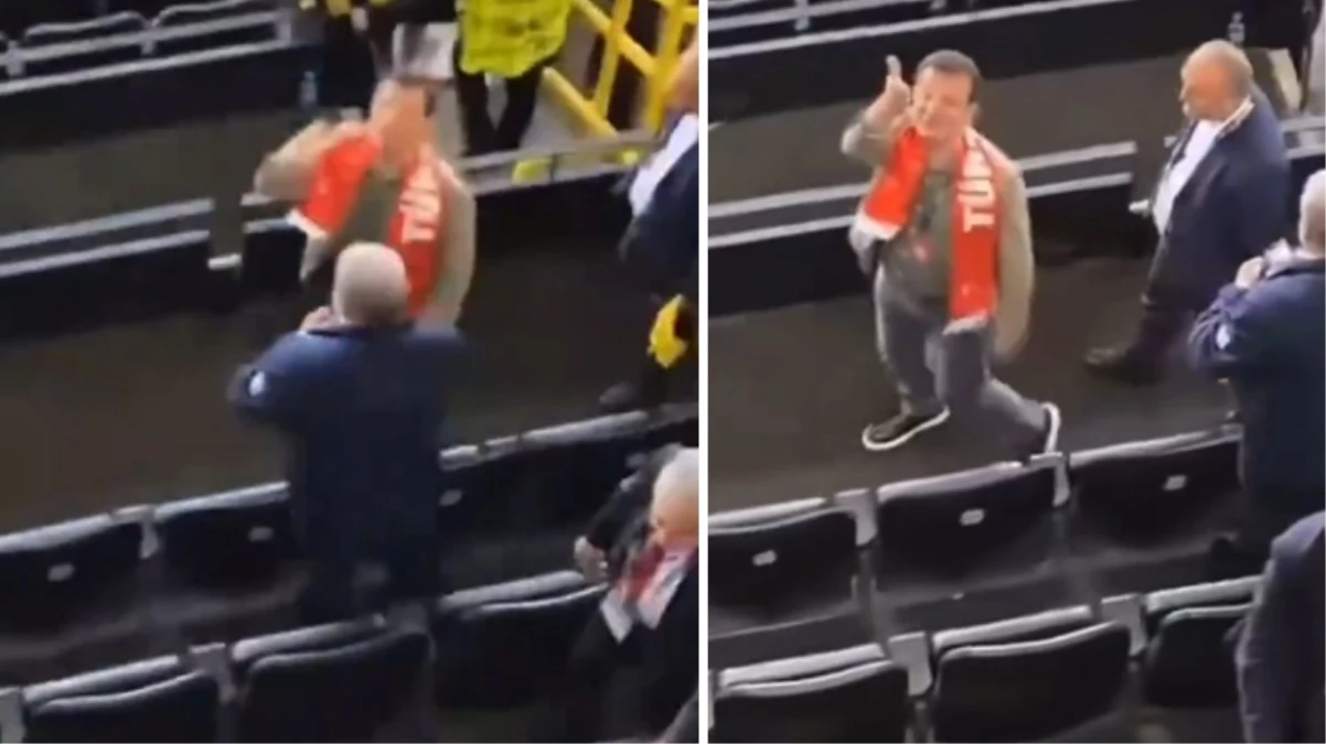 İstanbul Büyükşehir Belediye (İBB) Başkanı Ekrem İmamoğlu, Almanya'da oynanan milli maçta, tribünlerden kendisine "Erdoğan" tezahüratı yapan vatandaşlara öpücükle yanıt verdi.