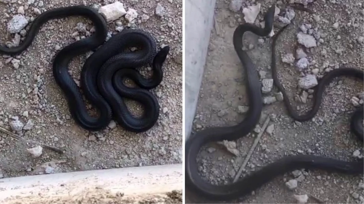 Gezin bölgesinde bulunan inşaat alanında çalışan işçiler, binanın alt tarafında kıvrılmış vaziyette bekleyen 3 metreyi aşkın boyuyla siyah bir yılan gördü.