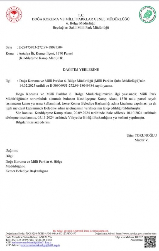 Kemer Belediyesi’nin alanın kamu yararına işletilmesi için yaptığı başvuruya rağmen, Tarım ve Orman Bakanlığı Doğa Koruma ve Milli Parklar Genel Müdürlüğü’nden gelen yazıyla ihalenin tamamlandığı ve alanın devredildiği bildirildi.15 yılı aşkın süredir Antalya’nın en önemli çevre sorunlarından biri olan Kındılçeşme Kamp Alanı’nın kamu yararına kullanılması için Kemer Belediyesi, çevreci kuruluşlar ve meslek odaları birçok kez miting ve basın açıklamaları düzenledi. Bu süreçte Kemer Belediye Meclisi, Ekim 2024’te oybirliği ile alanın belediye tarafından işletilmesi için kiralama talebinde bulunma kararı aldı. Kemer Belediyesi, alınan karar doğrultusunda Tarım ve Orman Bakanlığı’na başvurarak, Kındılçeşme’nin kamu yararına kullanılmak üzere belediyeye tahsis edilmesini talep etti. Ancak bakanlıktan gelen yanıt, bölgenin 20 Eylül 2024’te ihale edildiği ve 5 Kasım 2024’te Vilayetler Birliği Başkanlığı’na teslim edildiği yönünde oldu. CHP’li Kemer Belediyesi’nin alanı kamu yararına işletme talebine olumlu bakılmadı ve alan belediye yerine Vilayetler Birliği’ne devredildi.
