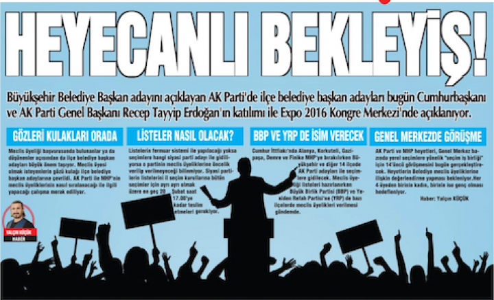 Büyükşehir Belediye Başkan adayını açıklayan AK Parti'de ilçe belediye başkan adayları bugün Cumhurbaşkanı ve AK Parti Genel Başkanı Recep Tayyip Erdoğan'ın katılımı ile Expo 2016 Kongre Merkezi'nde açıklanıyor.