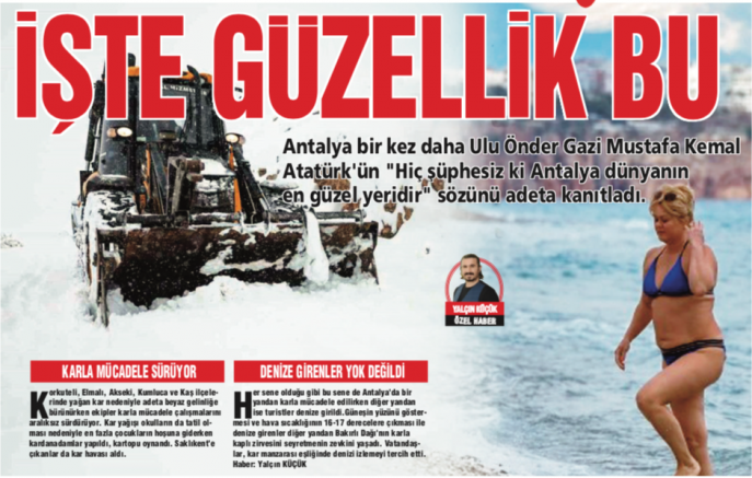 Her sene olduğu gibi bu sene de Antalya'da bir yandan karla mücadele edilirken diğer yandan ise turistler denize girildi.Güneşin yüzünü göstermesi ve hava sıcaklığının 16-17 derecelere çıkması ile denize girenler diğer yandan Bakırlı Dağı'nın karla kaplı zirvesini seyretmenin zevkini yaşadı. Vatandaşlar, kar manzarası eşliğinde denizi izlemeyi tercih etti.
