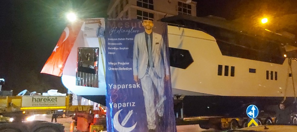 ANTALYA’nın Döşemealtı ilçesinde Yeniden Refah Partisi’nin belediye başkan adayı Mesut Hekimoğlu, Dubaili iş insanı için 3 yılda fabrikasında yapılan lüks yatın yüklendiği kamyonun en önde yer aldığı konvoyla seçim turu attı.