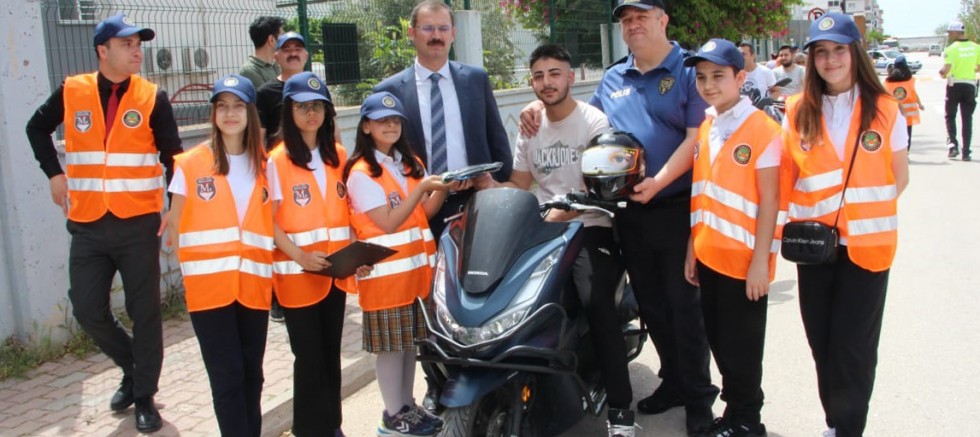 ANTALYA'nın Kumluca ilçesinde öğrenciler tarafından hazırlanan proje kapsamında trafik polislerinin gerçekleştirdiği uygulamada motosiklet sürücülerine kask dağıtıldı.