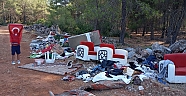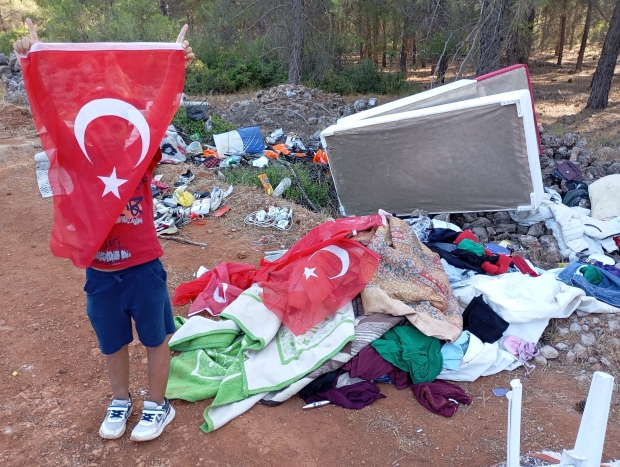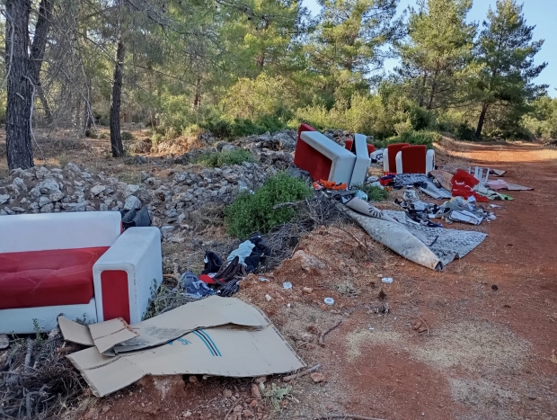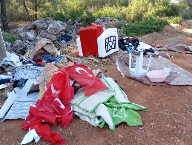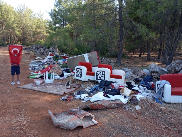 Ormana yürüyüşe çıkan bölge sakinleri, sera atıkları ve çöplerle karşılaşmaya alışıkken bu kez durumun çok daha vahim olduğunu gördüler. Ormanlık alana koltuk takımları, mutfak araç gereçleri, kadın ve erkek kıyafetleri, ayakkabılar gibi ev eşyaları atılmış durumda. Hatta ormanda Türk bayrakları ve kişisel eşyalar bile bulunuyor.