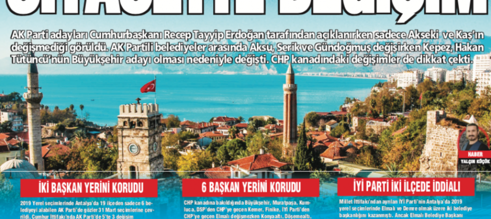 AK Parti adayları Cumhurbaşkanı Recep Tayyip Erdoğan tarafından açıklanırken sadece Akseki ve Kaş’ın değişmediği görüldü. AK Partili belediyeler arasında Aksu, Serik ve Gündoğmuş değişirken Kepez, Hakan Tütüncü’nün Büyükşehir adayı olması nedeniyle değişti. CHP kanadındaki değişimler de dikkat çekti.