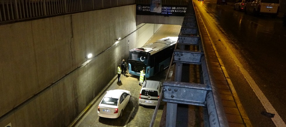 Meteorolojinin 'turuncu kod' uyarısı verdiği Antalya'da, pazartesi gece saatlerinden itibaren yoğun yağış etkili oldu. 300 kilogramdan fazla yağışın düştüğü Antalya'da Gıyaseddin Keyhüsrev alt geçidi, yağmur sularıyla doldu. Yağışın başladığı pazartesi gecesi tünelde aracıyla mahsur kalan Halil Yıldız, yaşamını yitirdi. Trafik Şube Müdürlüğü'nün talimatıyla ekipler, tüneli trafiğe kapattı. Dün akşam saatlerinde trafiğe kapatılan tünelde, adı öğrenilemeyen şoförün kullandığı 07 AU 0213 plakalı halk otobüsü de mahsur kaldı. Çevredekiler, durumu 112 Acil Çağrı Merkezi'ne bildirdi. İhbarla bölgeye gelen polis ekipleri, otobüsü mahsur kaldığı yerden çıkarabilmek için çalışma başlattı. Otobüs çekiciyle tünelden çıkarıldı. Halk otobüsünde yolcu olmadığı öğrenildi.