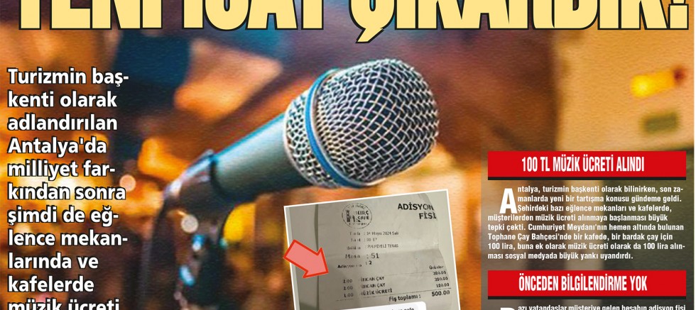 Türkiye'nin dört bir yanında olduğu gibi Antalya'da da müzik ücreti alınması tartışmalara neden oldu. Cumhuriyet Meydanı'nın hemen altında bulunan Tophane Çay Bahçesi'nde bir kafede bir bardak çaya 100 lira alınırken müzik ücreti olarak da 100 lira alınması yeni bir tartışmayı da beraberinde getirdi.